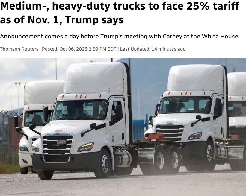 特朗普当天在社交媒体发文说:“自2025年11月1日起,所有从其他国家进入美国的中型和重型卡车将被征收25%的关税。”
