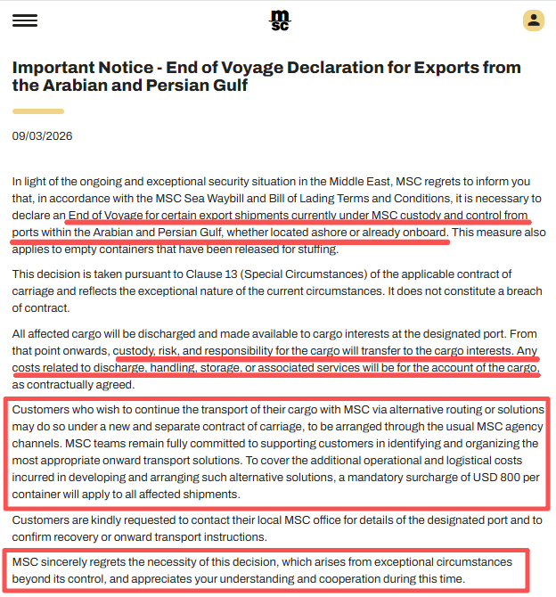 3月9日,MSC宣布对于目前由MSC保管和控制的、从阿拉伯湾和波斯湾港口出发的货物(无论其位于岸上还是已在船上),必须申报航程结束。货物在指定港口卸船并交付后,其保管、风险与责任将转移至货主或相关货物利益方;同时,卸船、码头操作、仓储及相关物流费用将按合同由货方承担。此外,为覆盖额外运营和物流成本,MSC还将对受影响货物加收每个集装箱800美元的强制性附加费。