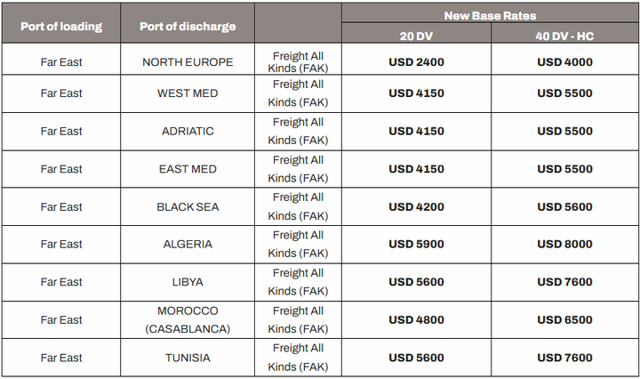 3月9日,地中海航运公司(MSC)发布公告称,自2026年3月22日起至另行通知为止(但不超过2026年3月29日),从所有远东港口(包括但不限于日本、韩国和东南亚的港口)到北欧、地中海(包括西地中海、东地中海、亚得里亚海和北非)以及黑海港口的运费将调整FAK费率如下: