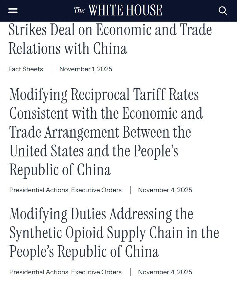 美东时间2025年11月4日,特朗普正式签署了两项行政命令,分别是:降低针对中国的所谓“芬太尼关税”(Fentanyl tariff);延长部分“对等关税”(Reciprocal tariff)的暂停期限。