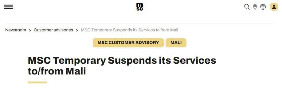 近日,MSC宣布全面暂停马里航线预订。MSC表示,由于安全问题和燃油短缺导致的重大运营挑战,运往马里的货物公路运输暂时停止,直至另行通知。