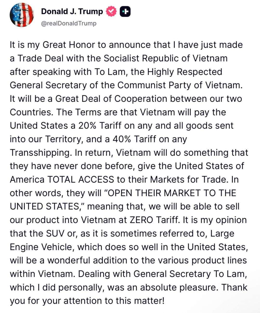 最新消息,北京时间7月2日晚,美国总统特朗普在社交媒体发文称,经数周密集外交谈判,已与越南达成贸易协议。协议规定,越南出口至美国的全部商品将被征收20%关税,经越南转运至美国的货物则面临40%关税,不过美方尚未公布适用40%关税的具体商品清单。