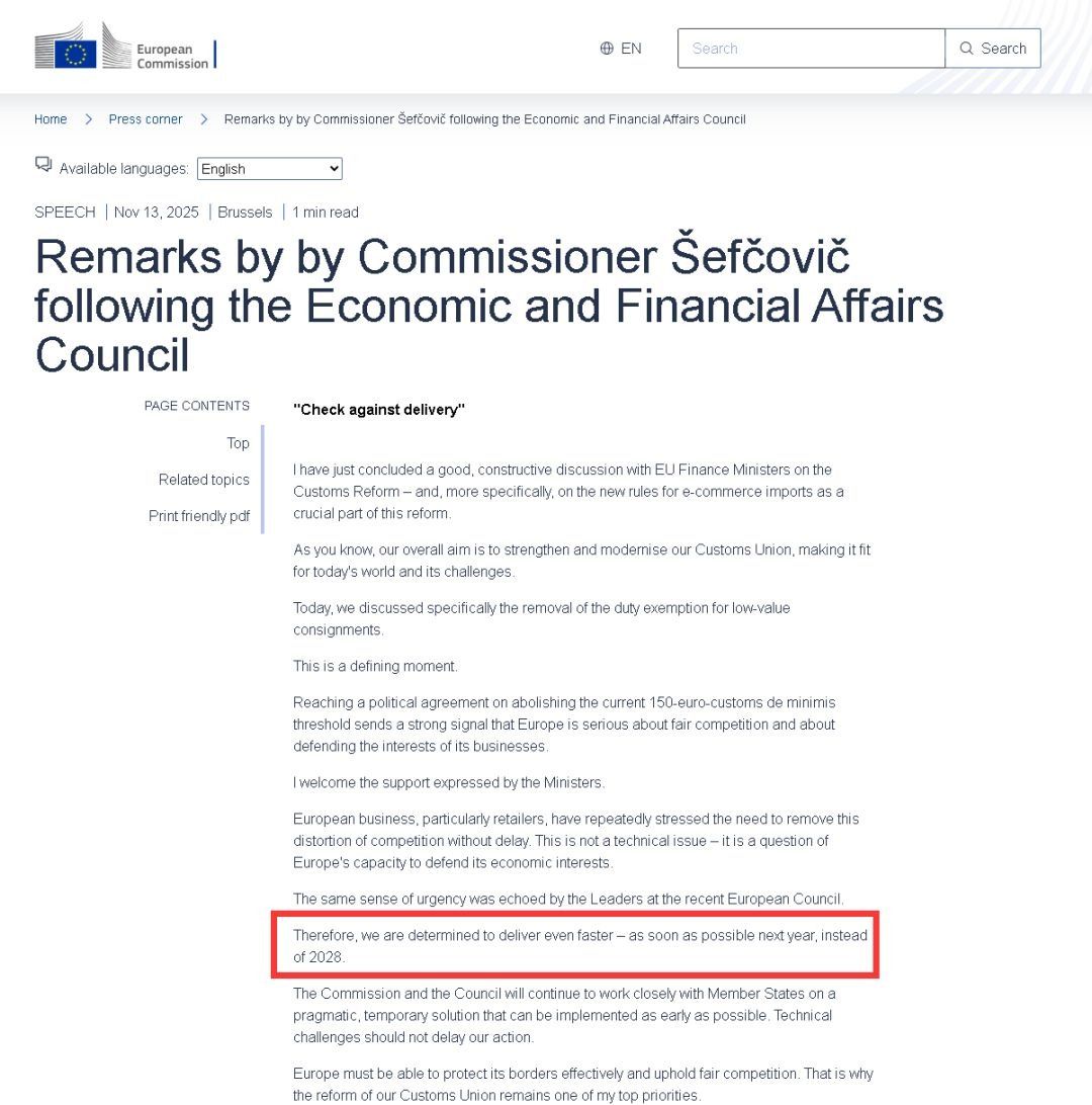 欧盟:“2026年开始对小额包裹征税是一项临时措施,旨在欧盟海关新系统成型前作为过渡,这一临时措施(过渡期)将会持续至2028年。”