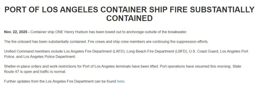 根据洛杉矶港11月22日的最新通告,“船上的火势已被基本控制。消防队伍和船员正在继续进行灭火工作。洛杉矶港码头的居家令和工作限制已被解除。港口运营已于今晨恢复,SR-47公路重新开放,港区交通恢复正常。“