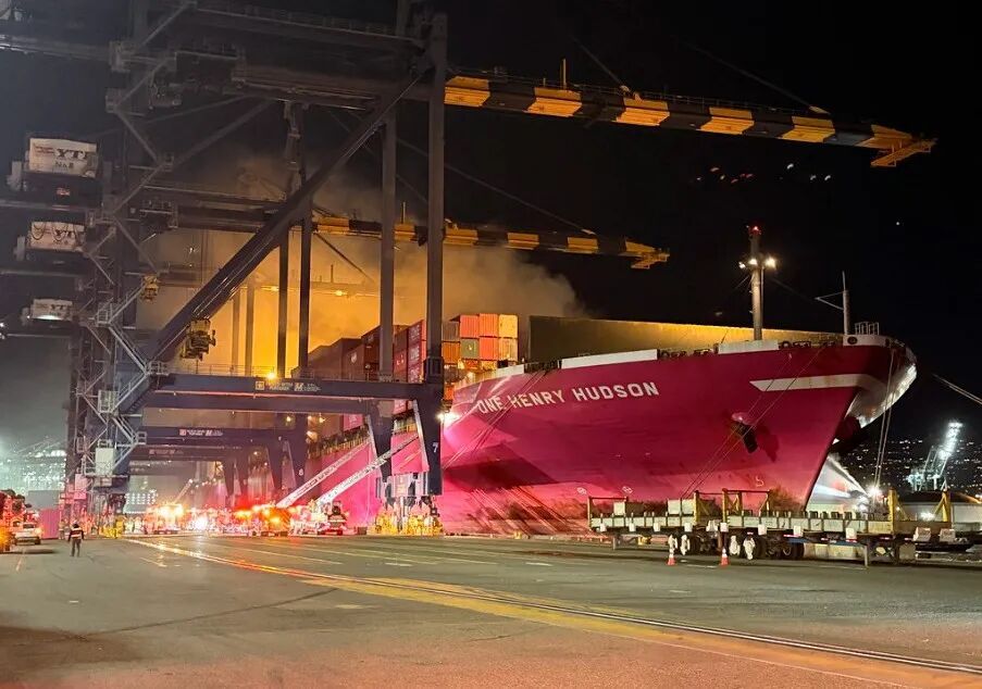 据洛杉矶消防局(LAFD)和港口官员称,当地时间11月21日晚,一艘名为“ONE HENRY HUDSON”的集装箱船在下层甲板突发电气火灾。事故导致船只发生爆炸,洛杉矶港多个集装箱码头暂停运营。