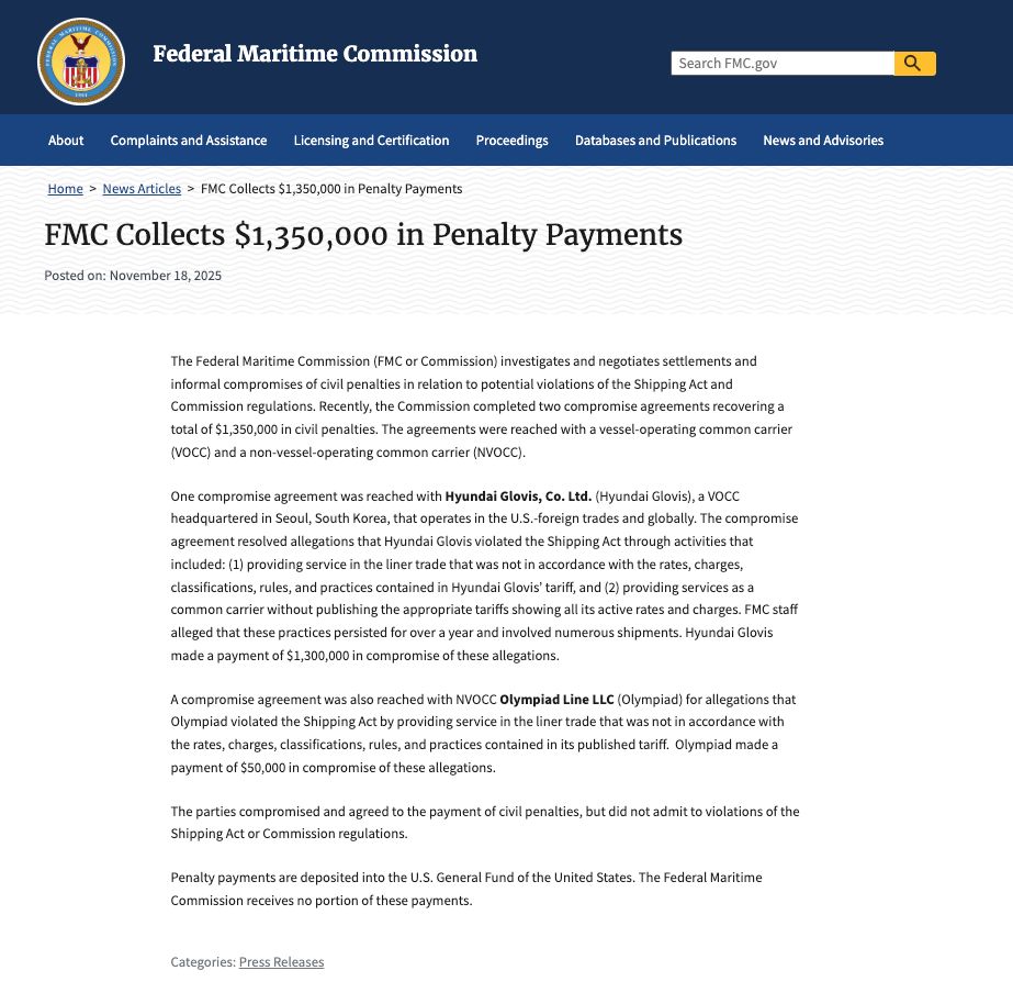 据通报称,目前船公司-现代格罗维斯和货代-奥林匹亚航运有限公司均已缴纳罚款,与FMC达成了两项和解协议,Hyundai Glovis同意支付130万美元,Olympiad支付了5万美元以解决这些指控。