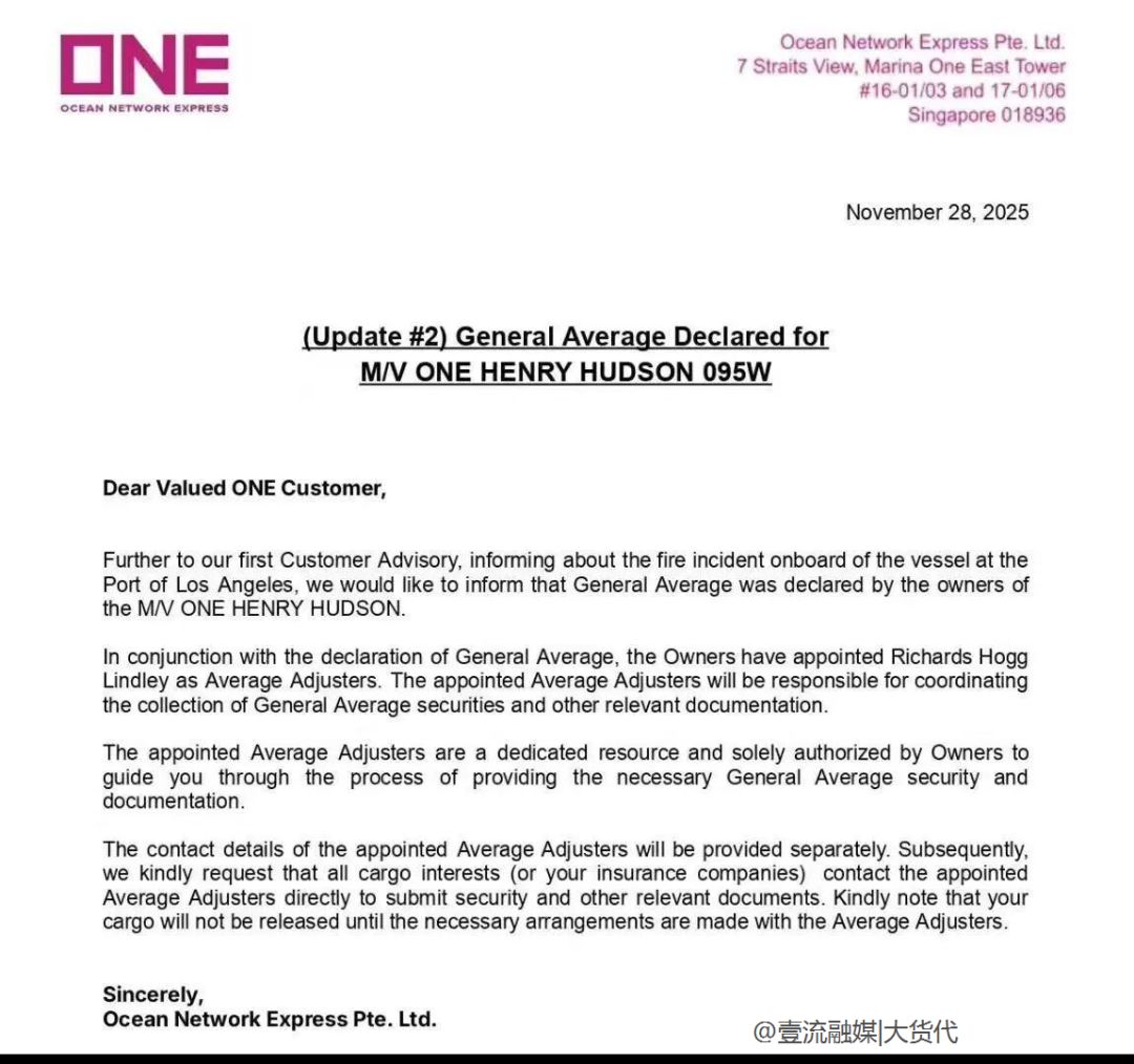 根据消息显示,在集装箱船“ONE HENRY HUDSON”号发生起火事故一周后,ONE于当地时间11月28号,正式发布通知于,表示该船的船东已基于这起事故,宣布共同海损!