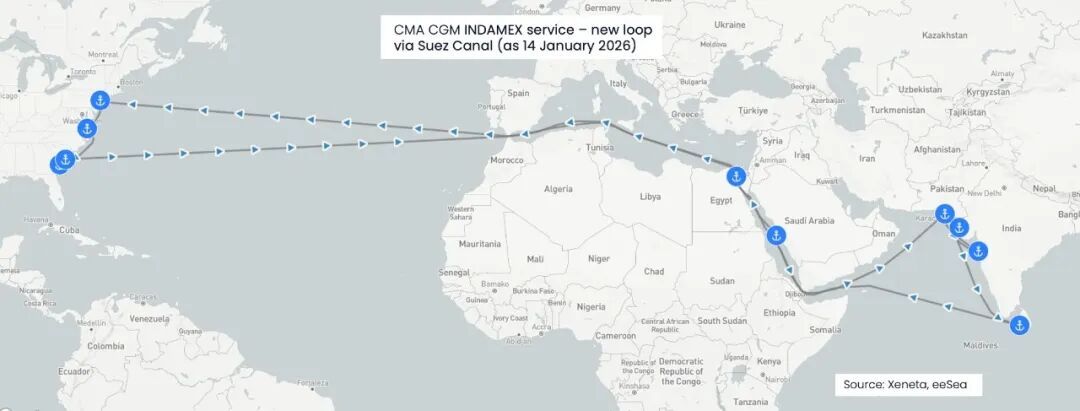 航运巨头达飞轮船宣布了一项重要举措,其服务于印度/巴基斯坦和美国东海岸之间的“INDAMEX航线”将重返苏伊士运河,这被视为集装箱船大规模回归红海地区的关键一步。