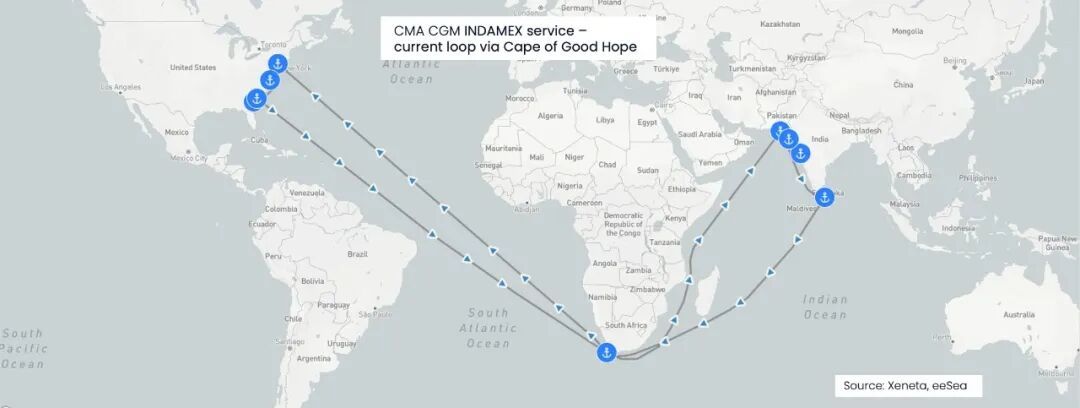 首艘经由苏伊士运河完成全程航线的船舶确定为“CMA CGM VERDI”号,该船计划于1月15日从卡拉奇启程前往纽约。据海运和空运运价基准和市场信息服务提供商Xeneta旗下eeSea的数据显示,相较于经由好望角的航线,经苏伊士运河的航程可使全程航行时间大幅缩短两周,总时长降至77天。