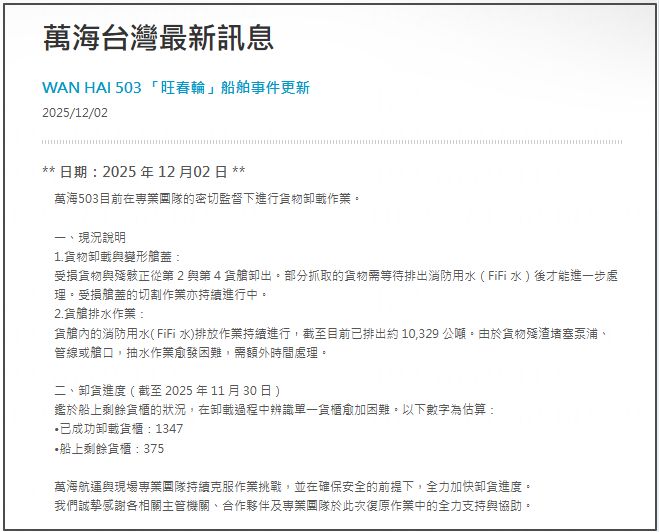 万海表示,该轮目前在专业团队的密切监督下进行货物卸载作业。