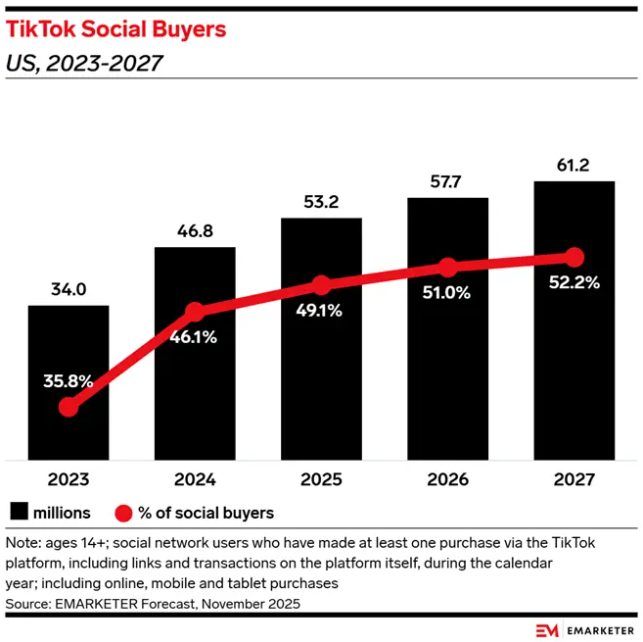 eMarketer预计,到2026年,TikTok的购物用户规模将覆盖超过50% 的美国社交购物人群,意味着每两位通过社交媒体进行购物的消费者中,就有一位曾在TikTok平台上完成过购买。需要指出的是,这一统计口径涵盖TikTok整个平台的购物行为,并不仅限于TikTok Shop。