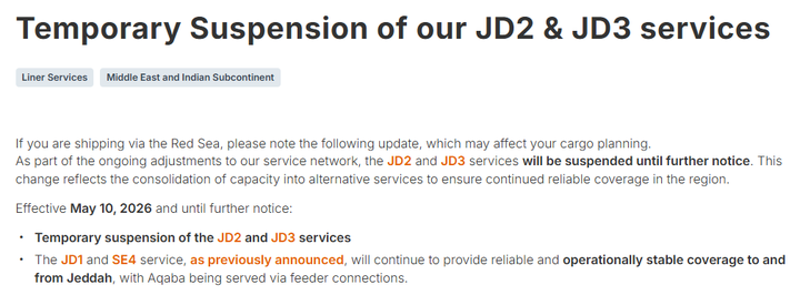 据介绍,JD2航线此前连接丹吉尔、塞得港东港及吉达等关键节点,JD3航线则覆盖塞得港东港、亚喀巴与吉达等港口。两条航线的停运,意味着红海区域多条支线运输能力被削弱。虽然部分运力将被重新分配至JD1、SE4等替代航线,但业内普遍认为,替代方案难以完全弥补原有航线的舱位和时效损失。