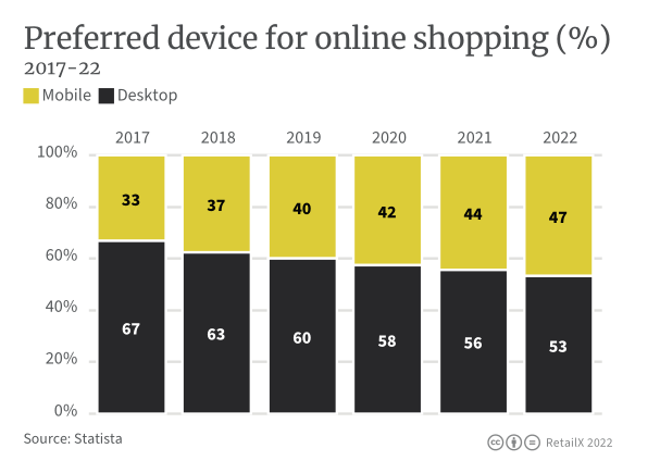 3/4的美国消费者仍然喜欢线下购物体验,但喜欢线上购物的人数在过去5年中增长了11%。线上购物的首选设备也发生了变化,47%的消费者更喜欢使用移动端而非桌面端,这一比例自2017年以来增长了14%。